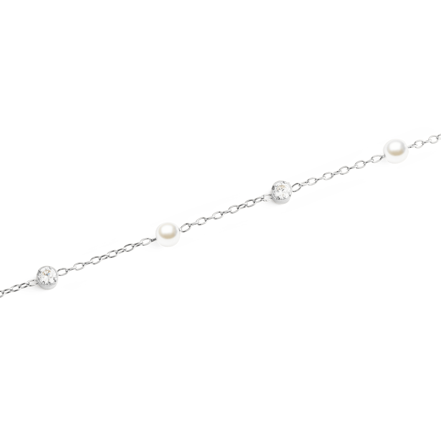 Seven fixed round elements create a balanced rhythm along the chain: 3.0 mm white Swarovski glass pearls alternate with 2.2 mm white cubic zirconia. The cool silver tone comes from polished 316L stainless steel. Slim proportions and a lightweight feel make it easy to wear solo or layer with a watch and other chain bracelets. A refined addition to women’s chain bracelets and dress bracelets.