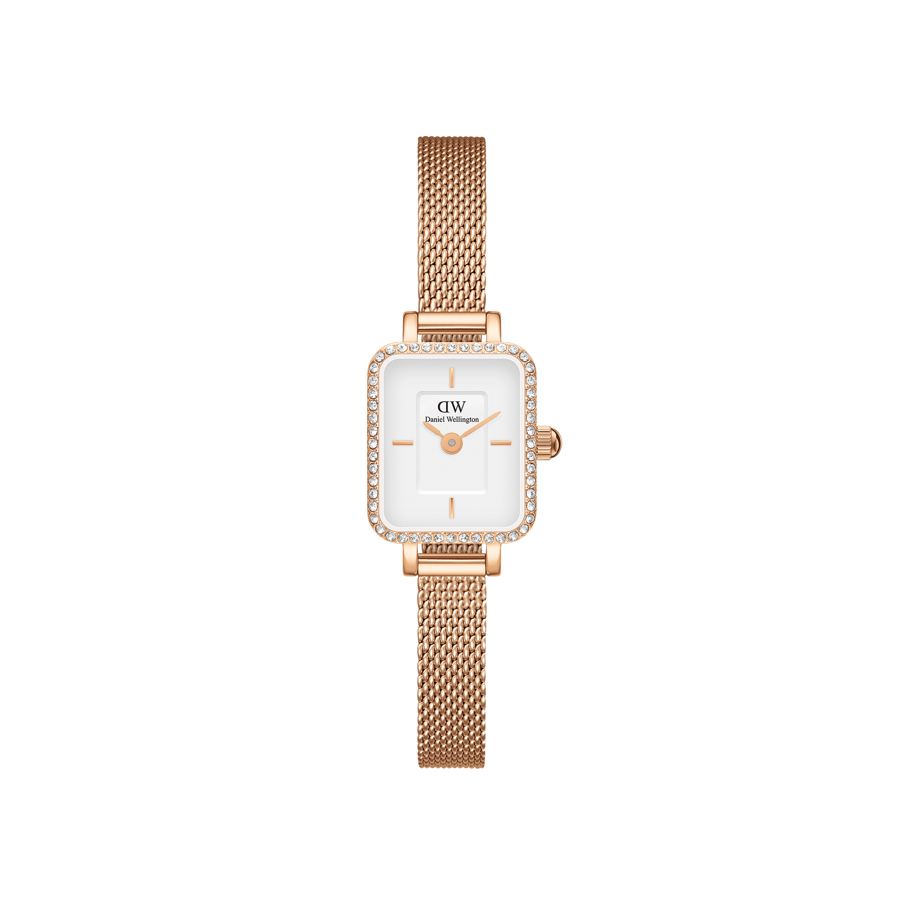 The cool corners of Quadro, shrunk down into our smallest watch ever. This Quadro Mini Lumine Bezel features carefully-set crystals and an interchangeable rose gold mesh strap.