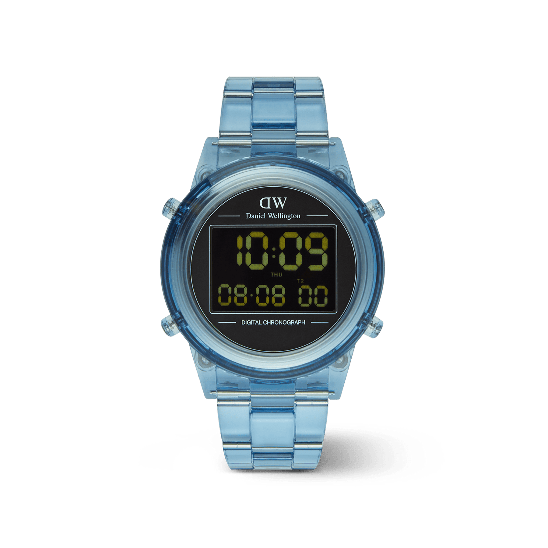 Introducing the Retro Digital Watch: a blast from the past with all the modern features you need. Crafted from transparent bio-based plastic in a cool tone color palette, this timepiece effortlessly blends throwback charm with contemporary materials for a truly distinct aesthetic. And while its silhouette takes inspiration from our renowned Iconic Link design, we’ve gone truly digital with 10-digit dual time display, auto calendar with a daily alarm and hourly chime, and chronograph function. This light blue version is available in two sizes.