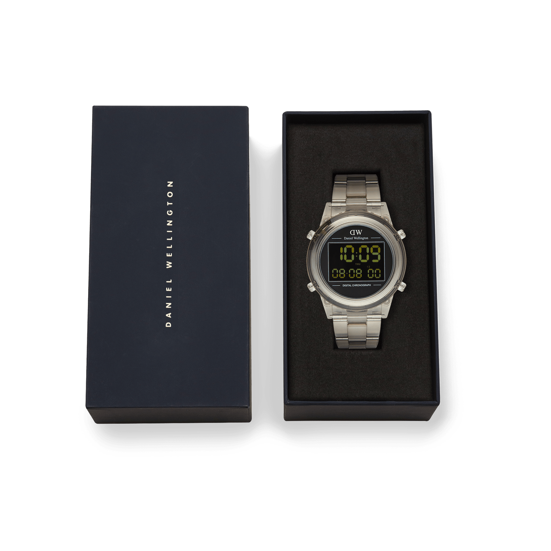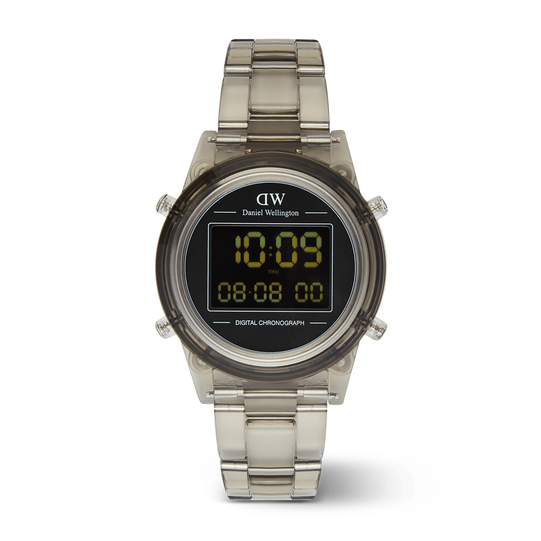 Introducing the Retro Digital Watch: a blast from the past with all the modern features you need. Crafted from transparent bio-based plastic in a cool tone color palette, this timepiece effortlessly blends throwback charm with contemporary materials for a truly distinct aesthetic. And while its silhouette takes inspiration from our renowned Iconic Link design, we’ve gone truly digital with 10-digit dual time display, auto calendar with a daily alarm and hourly chime, and chronograph function. This light grey version is available in two sizes.