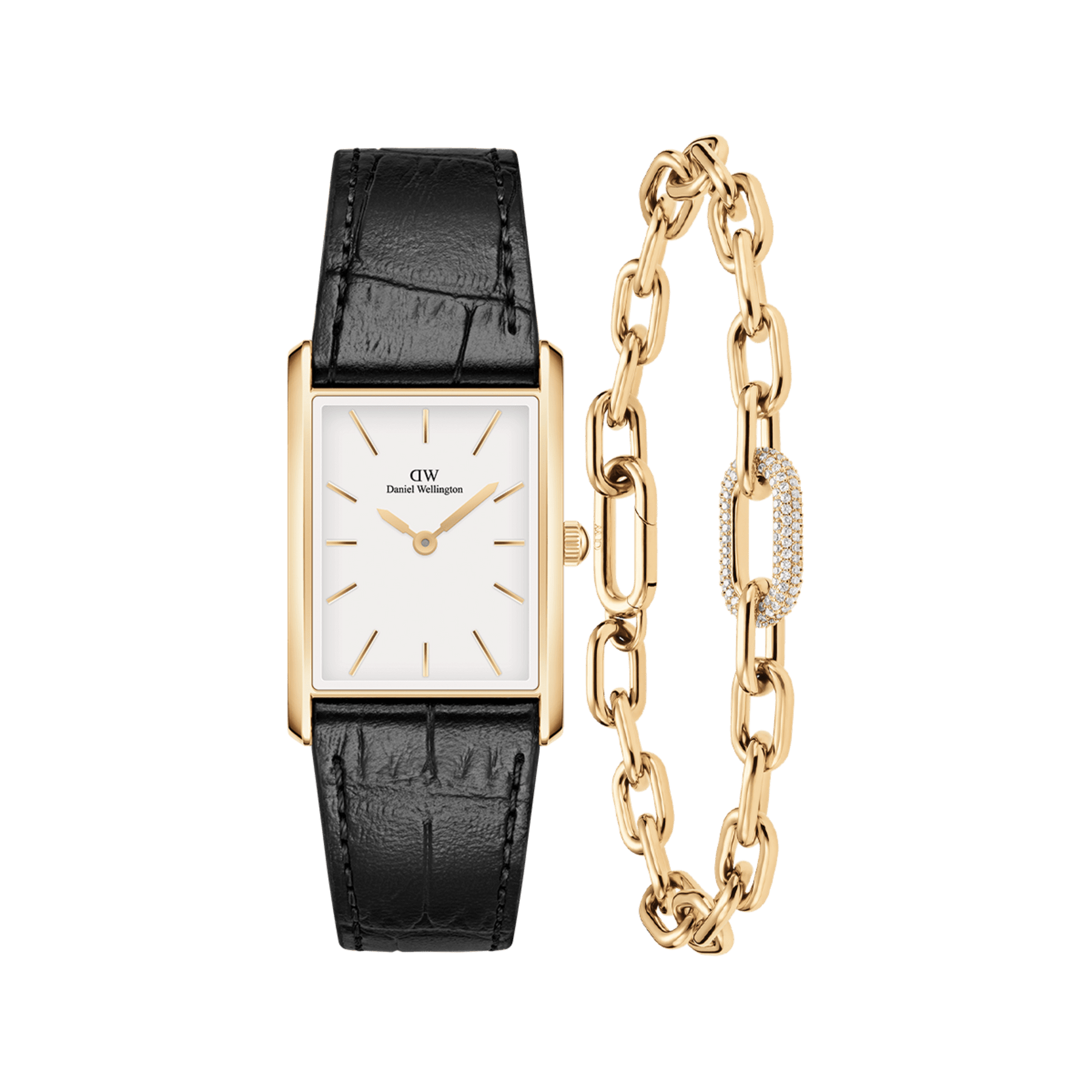 The Bound watch with gold details and black croc embossed strap and the Crystal Link bracelet are pieces that pair perfectly to make any outfit go from daytime chic to evening glam in an instant.