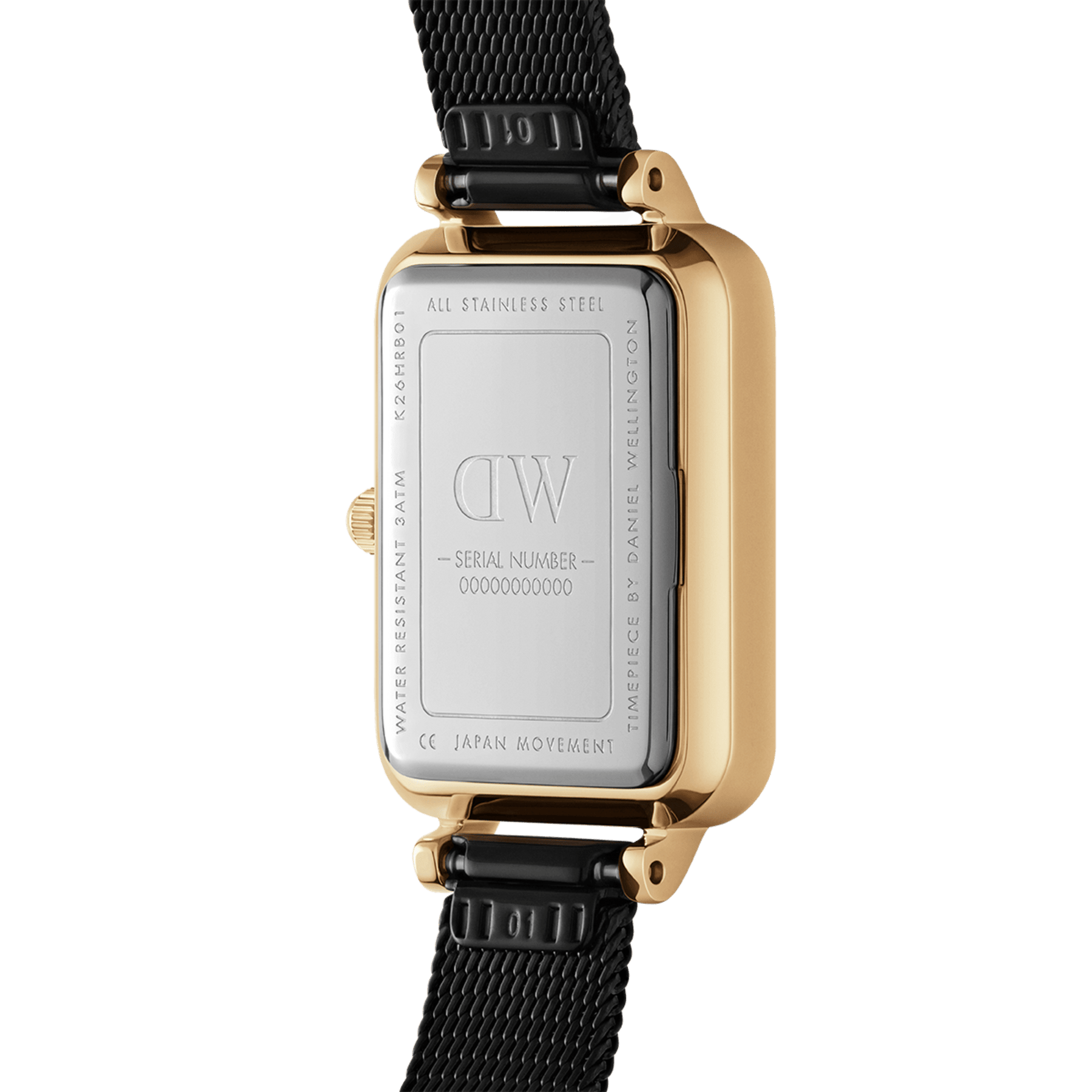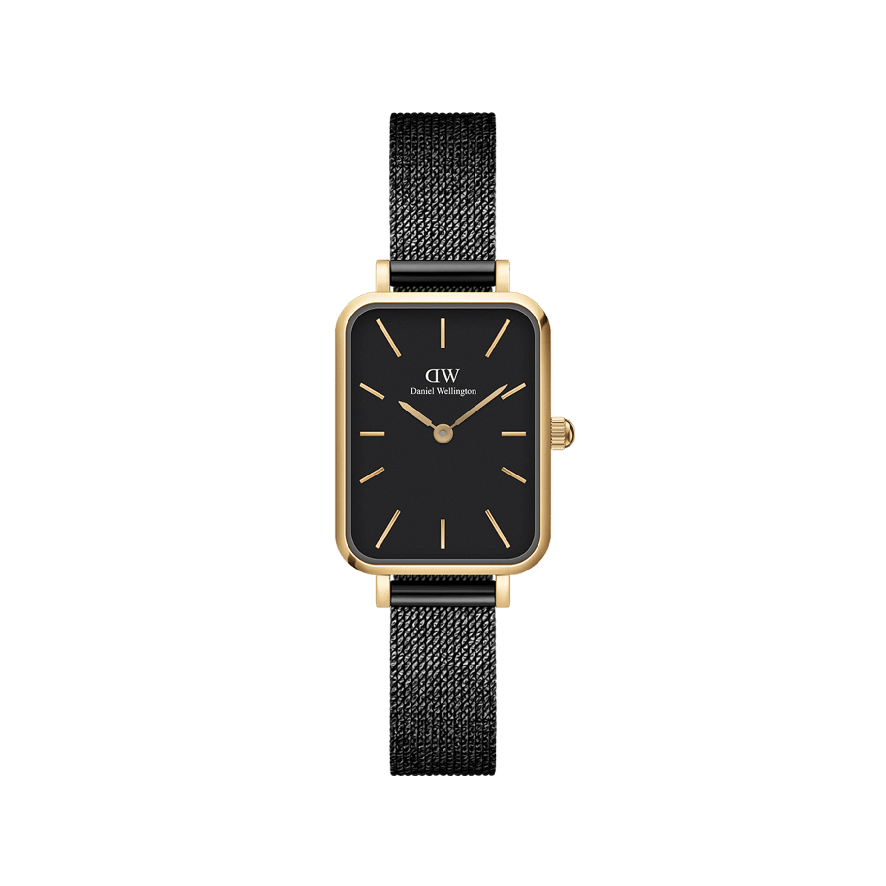 The Quadro Pressed Ashfield invites us to be curious. It challenges us to test limits and wonder how far we can go to pursue beauty and original design. This small women’s watch is almost 100% black, with its mesh bracelet and deep black dial, yet it’s incredibly expressive. The gold details of this square watch shimmer tastefully against the monochrome backdrop created by the dial and strap. So, accept the invitation to be curious and get the Quadro Pressed Ashfield or explore other black watches from our collection. Square watch with black mesh bracelet, black dial and gold details. Small women's watch.
