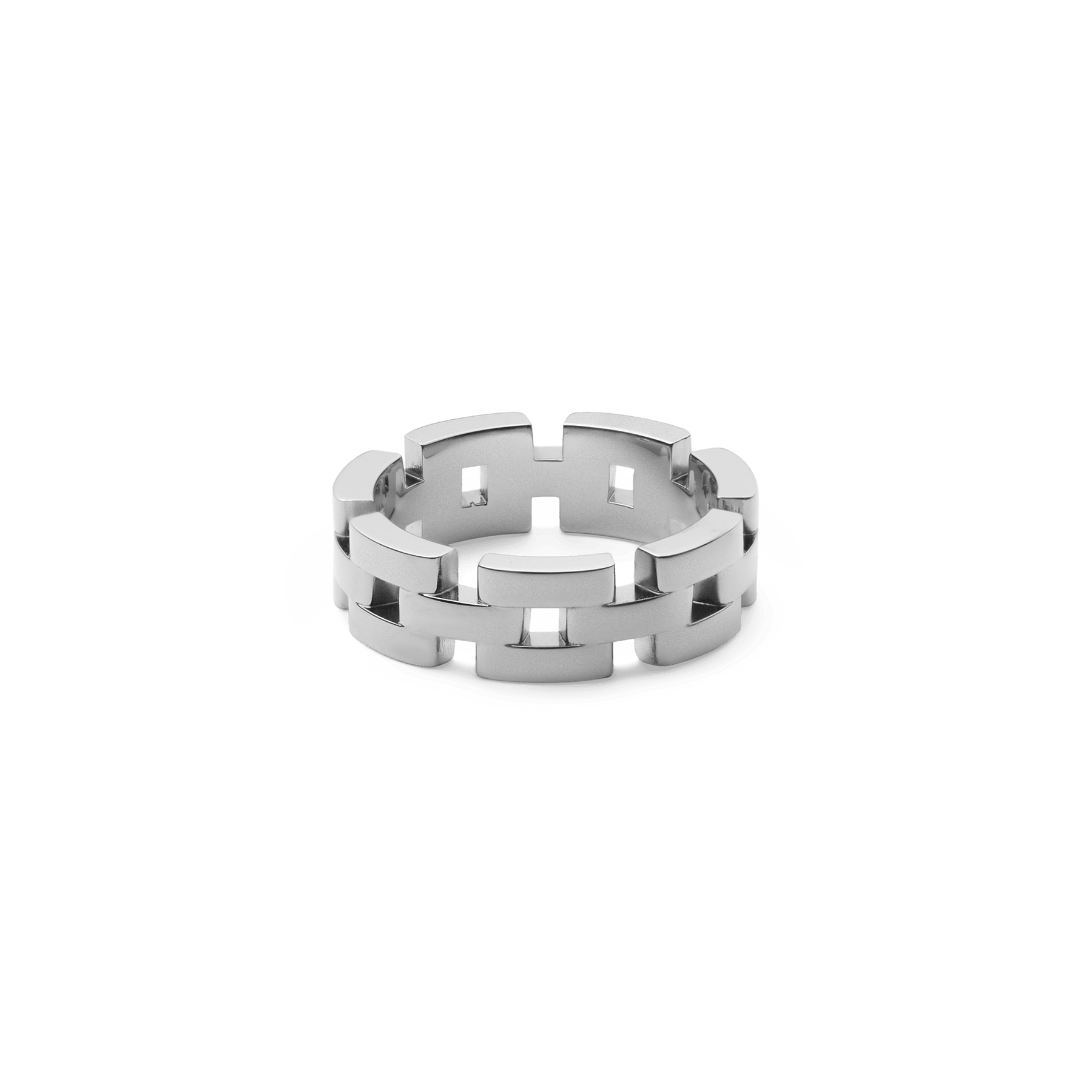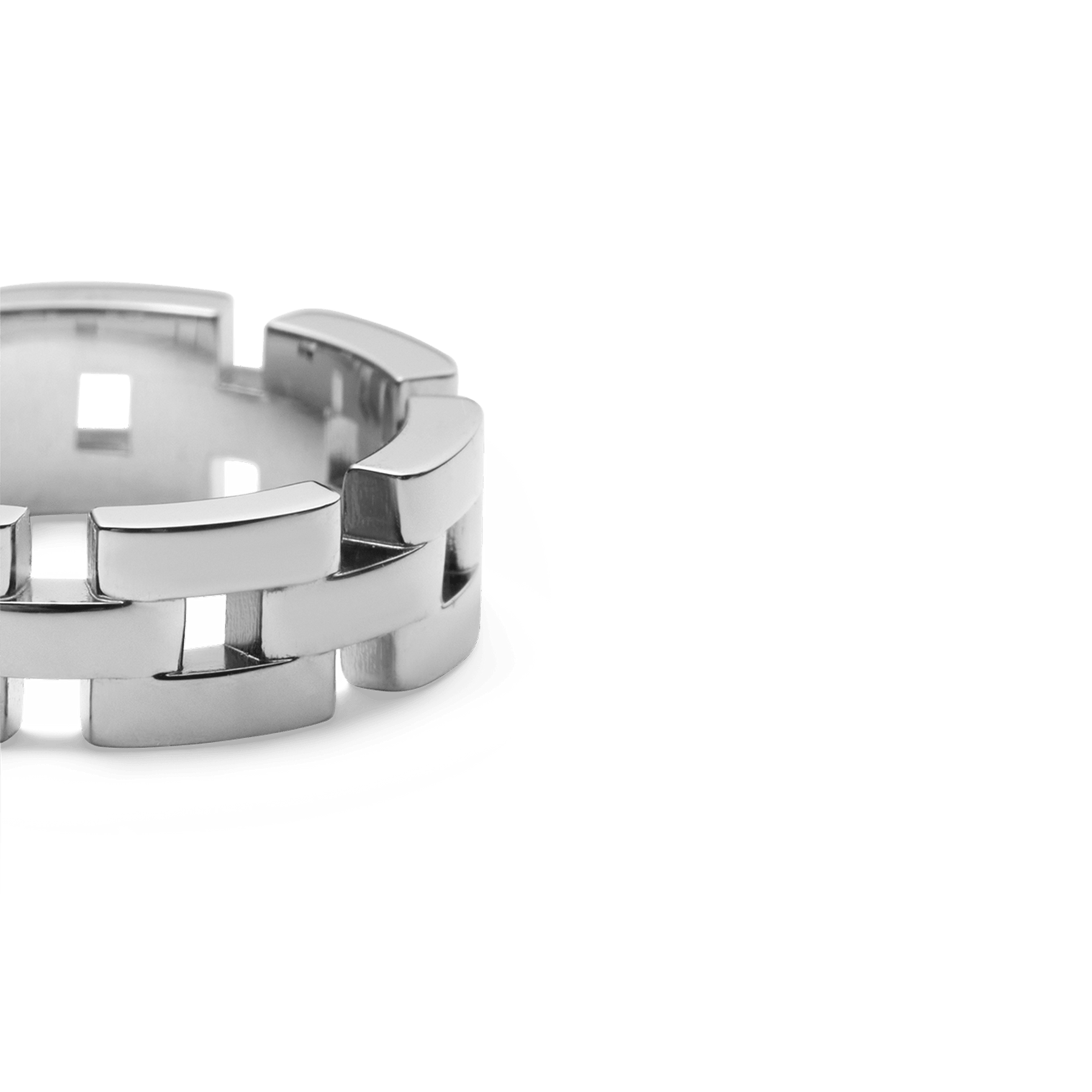 This silver ring was designed to match the aesthetic of our link watch straps—but in a smaller, more jewelry-like form. We kept the proportions intact while introducing subtle gaps between the links for an even more refined look. Worn alone or perfectly paired with your favorite watch, the bold link design adds depth and movement to your hand. Available in two sizes, with 3 or 5 links.