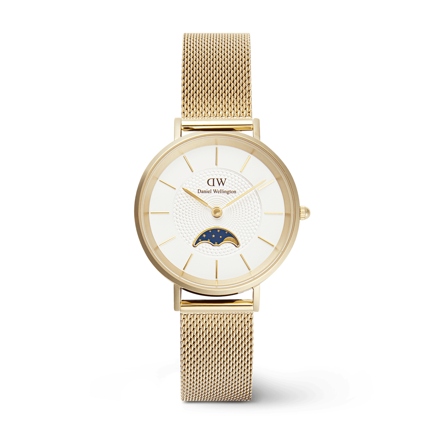 Stay in tune with the moon’s cycles. Petite Lune features a unique moon-phase sub-dial, which keeps track of where we are in the month, spinning from new to full moon and back again. The gold mesh strap is interchangeable, so it can match your style day or night—under the sun or the stars.