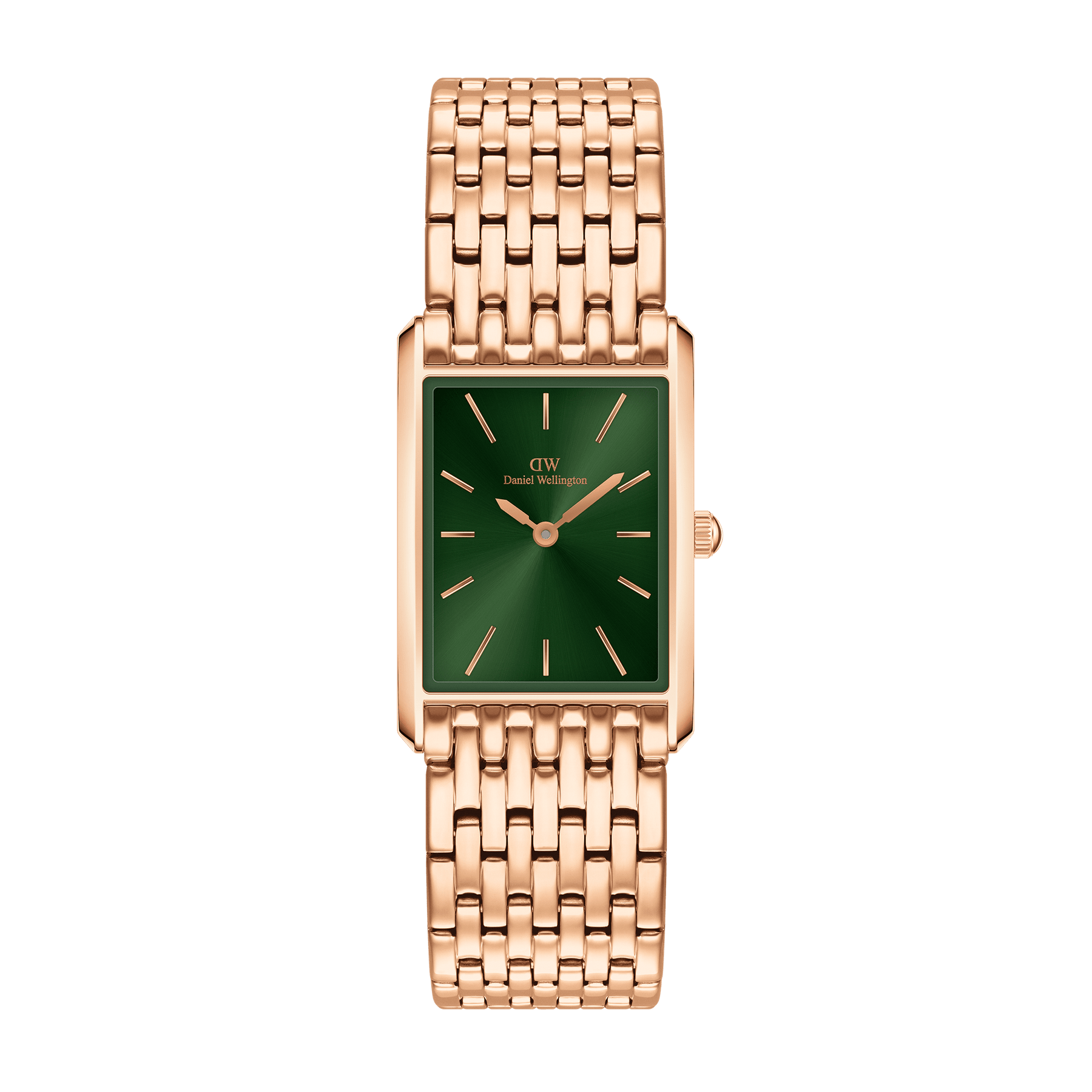 With sleek geometric edges and two sizes to choose from, our Bound collection brings perfect symmetry to your wrist. The curved rectangular case of this rose gold watch matches the exact width of its 9-link strap—giving you a seamlessly integrated emerald sunray dial.