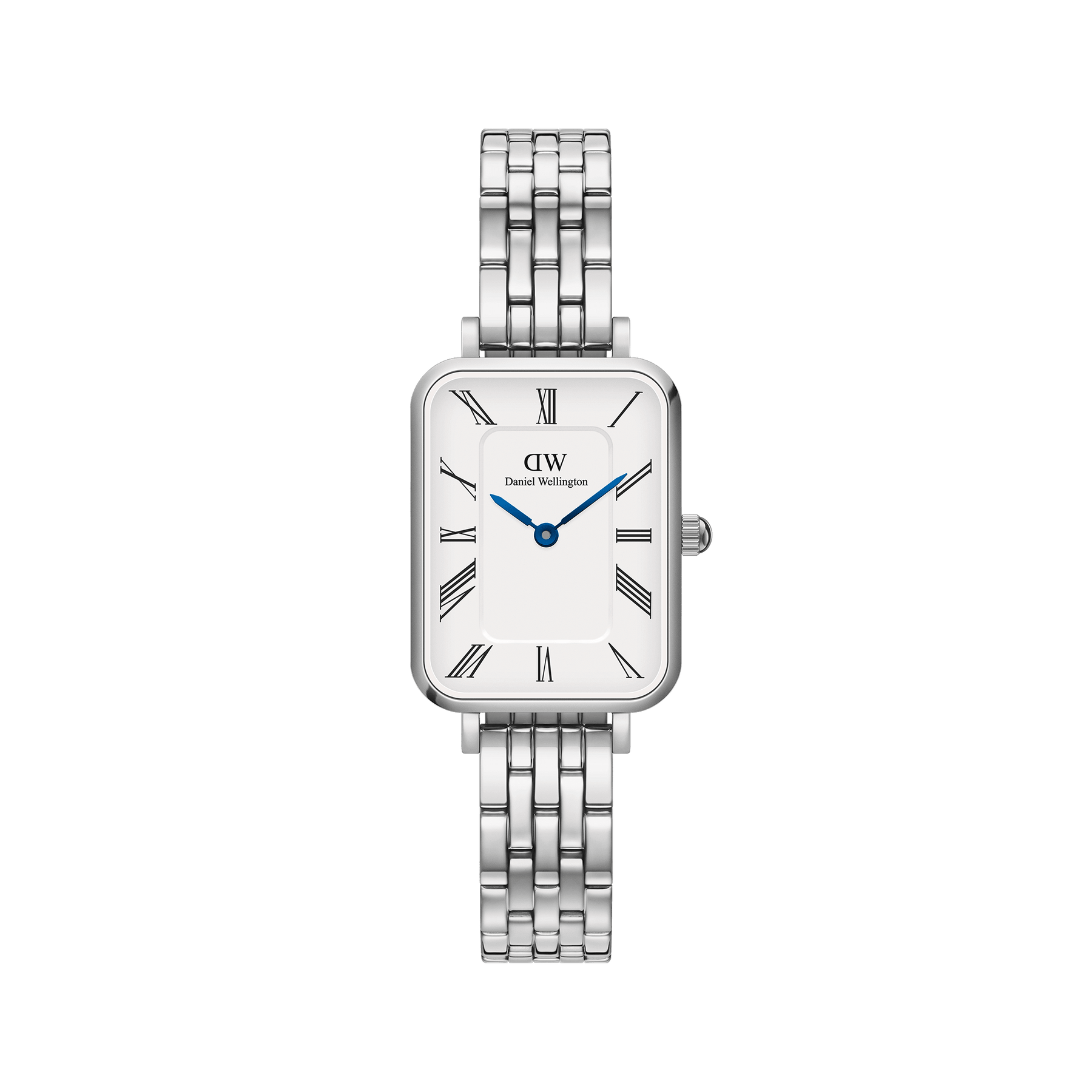 With vintage-inspired design details—like the Roman Numeral dial and blue steel hands—this version of our Quadro watch strikes just the right balance between old-school and trending now. Features an interchangeable 5-link strap in silver.