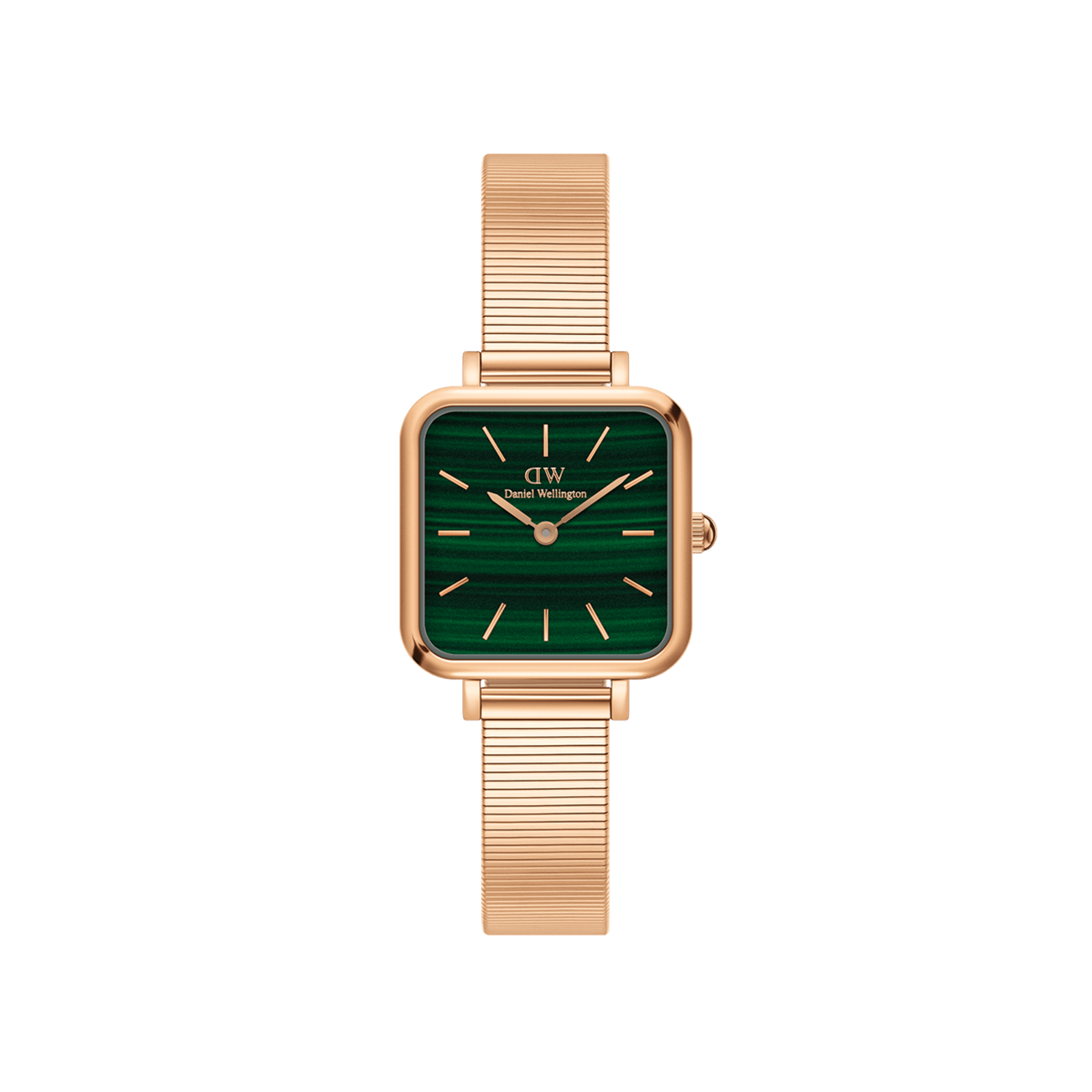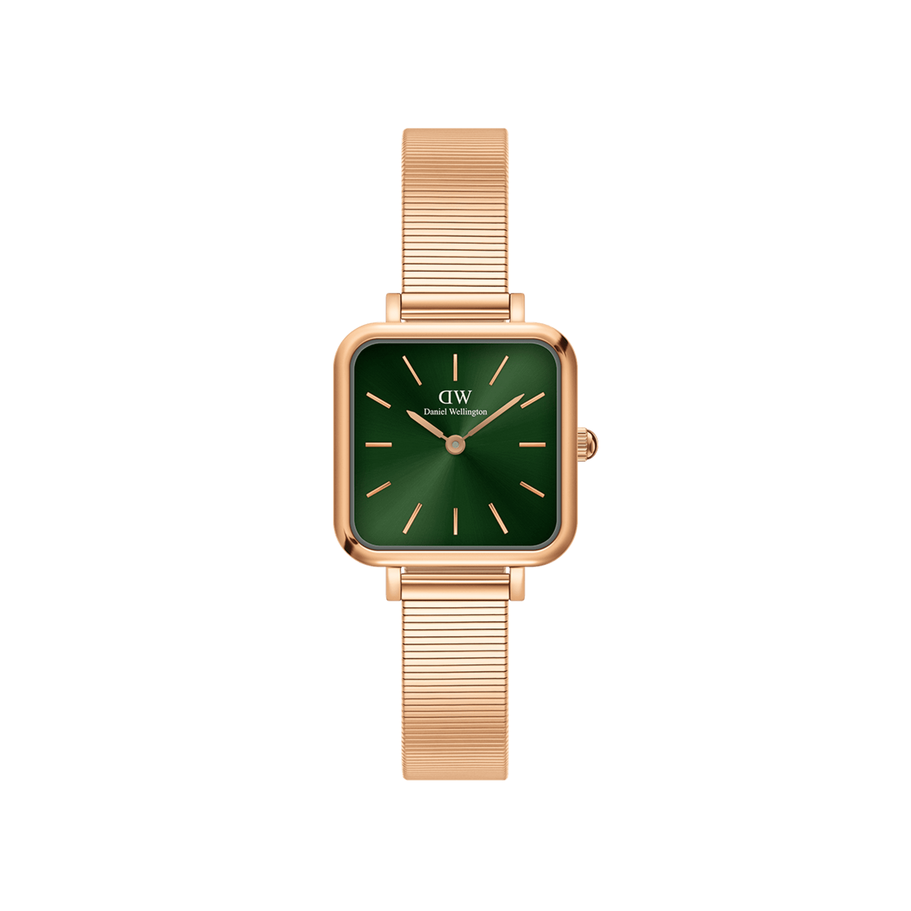 The Quadro Studio features a delicate and petite, glossy emerald green dial, complemented by the sleek Piano strap. Crafted with polished stainless steel and available in a refined rose gold plating. A retro statement with timeless appeal.